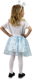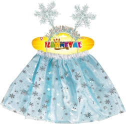Kék szoknya csillogó hópelyhekkel és szatén derékkal, amely téli varázst hoz.