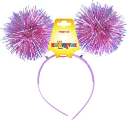 A fejpánt két nagy, ragyogó pom-pom gömbbel van díszítve, amelyek felkeltik a figyelmet és vidám hangulatot kölcsönöznek.
