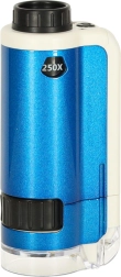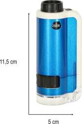 Fedezze fel a lenyűgöző mikroszkopikus világot a zsebmikroszkóp segítségével. Ez a készülék lehetővé teszi különböző tárgyak, mint például levelek, textilszálak vagy sókristályok részletes vizsgálatát a kettős nagyítással (100x, 250x). A mikroszkóp LED lámpával van felszerelve, amely optimális megvilágítást biztosít.