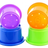 Négy, számokkal és nyílásokkal ellátott pohár ideális toronyépítéshez, a számolás tanulásához és vízi játékhoz. Gyakoroltatják a fogást, a logikát és a koordinációt.