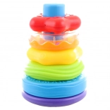 A különböző méretű, színes gyűrűk segítenek megkülönböztetni a formákat és színeket, fejlesztik a finommotorikát és a türelmet a pálcára rakosgatás során.