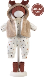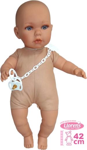 Ez a baba kézzel készült Spanyolországban, puha textil teste kellemes érzetet nyújt játék közben. A babával kislányként és kisfiúként is lehet játszani, köszönhetően a Llorens kínálatából 42 cm-es méretben megvásárolható ruháknak.