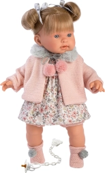 A Llorens Alexandra baba részlet gazdag kidolgozással készül, ötvözve a kiváló minőségű puha vinilt a fején és végtagjain, valamint a puha textil testet a kényelmes játék érdekében. Amikor a cumit kiveszik a szájából, valósághű hangokat ad ki, mint „mama” és „papa”, valamint síró baba hangját, mely elcsendesíthető a mágneses cumival.