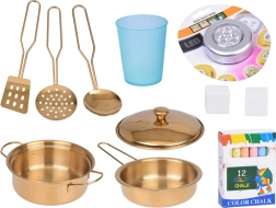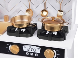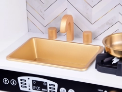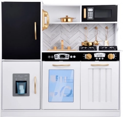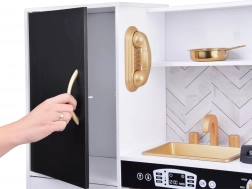 Fogja meg a gyerekek érdeklődését a főzés iránt ezzel a fából készült konyhával, amely a részletekre való odafigyeléssel készült. A konyha főként fehér, fekete és arany részletekkel, amelyek eleganciát sugároznak. A gyerekek krétával írhatnak a hűtőszekrényre helyezett táblára, imitálhatják a sütést a sütőben és ételeket készíthetnek realisztikus hang- és fényhatásokkal.