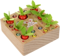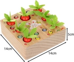 A KRUZZEL 2 az 1-ben fa játék örömet szerez a tanulás és játék során, színes kert dizájn formájában. A gyerekek imádni fogják utánozni a kertészeket miközben mágneses kukacokkal játszanak és sárgarépák elhelyezése a megfelelő lyukakba. A játék segít a formák és színek felismerésében, ezzel érzékelési készségeket fejleszt.
