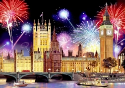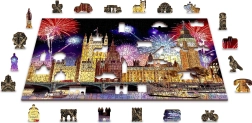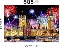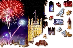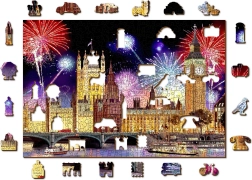 A 2 az 1-ben kétoldalas kivitel két kihívást ad egyben: az elején a tűzijátékkal díszített, színes londoni képet rakja ki, a hátoldalon pedig ismétlődő mintát formák alapján. A darabszám ellenére a változatos formák miatt igényesebb és szórakoztatóbb. A puzzle erős HDF lapból (3–4 mm) készül, és műanyagmentes, öko csomagolásban érkezik, mellékelt mintaképpel.