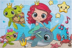 Fedezd fel a víz alatti világ varázsát a bájos sellőmotívummal. A 30 nagy darabos puzzle fejleszti a finommotorikát, a türelmet és a logikus gondolkodást a gyerekeknél. A nagyobb daraboknak köszönhetően kiváló választás a kisebbeknek, akik örömüket lelik a 29 × 18 cm-es kész képben.