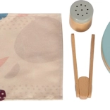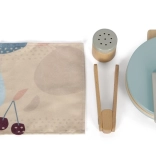 A készlethez textil szalvéta, biztonságos tálaláshoz való csipesz és egy cukorszóró is tartozik, amely szóráskor kellemes csörgő hangot ad. A tartós, fából készült kivitel modern színekben és kellemes anyagokkal ideális a gyerekkonyhába.