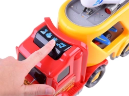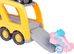 Színes gyerek autószállító repülők és autók számára, amely órákon át tartó kreatív játékot kínál. A vontató és a pótkocsi fény- és hanggombbal, frikciós meghajtással az egyszerű elinduláshoz és lehajtható rámpával a kényelmes berakodáshoz rendelkezik. A tartós műanyag kivitel és az élénk színek segítik a fantázia és a finommotorika fejlesztését.