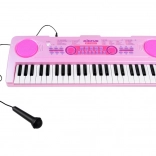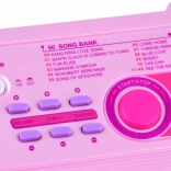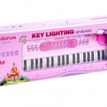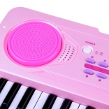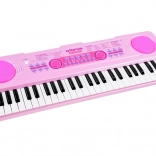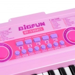 Rózsaszín BIGFUN gyermek keyboard világító billentyűkkel vidám zeneoktatást nyújt a kis zenészeknek. 49 billentyűt, 100 hangszínt, 100 ritmust, 50 demódalt, felvételt és lejátszást, valamint tempó- és hangerőszabályzást kínál. Tartozék a mikrofon, USB-táplálás, valamint MIC és AUX bemenetek.