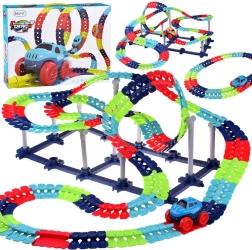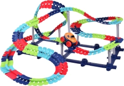 Építsen a gyerekeknek saját versenyvilágot: hosszú, hajlékony és csavart autópálya-készlet akár 291 darabbal, amellyel őrült hurkokat, hidakat és dombokat alkothat. A pálya hossza akár 580 cm, színes elemekből áll, és a tapadókorongoknak köszönhetően sima falakra vagy ablakokra is rögzíthető a valóban extrém építményekhez. A csomag része egy motoros kisautó világítással, jobb tapadást adó gumiszalagokkal a kerekeken, valamint USB-kábellel tölthető akkumulátorral.