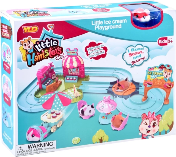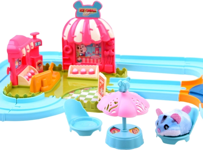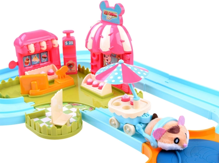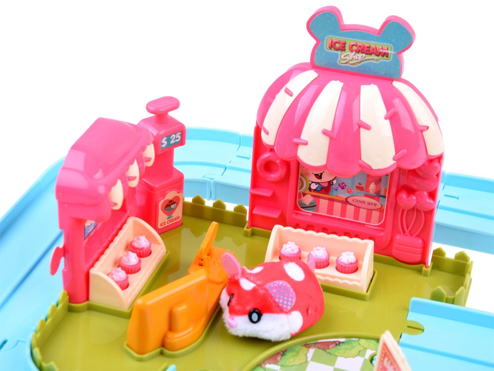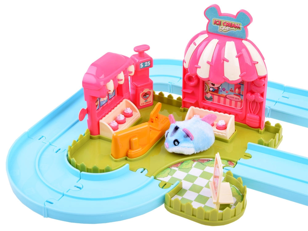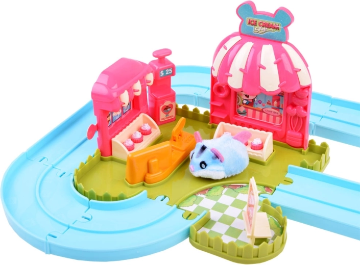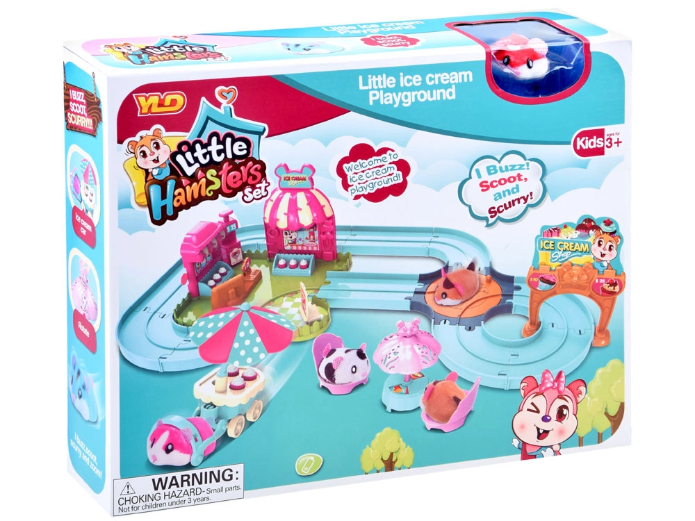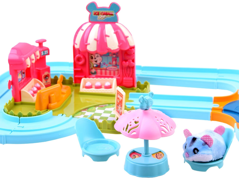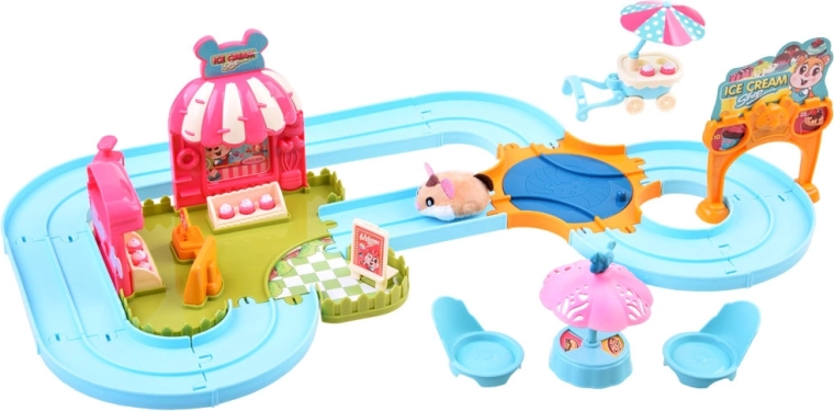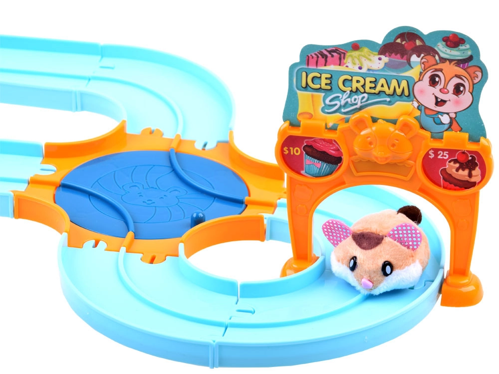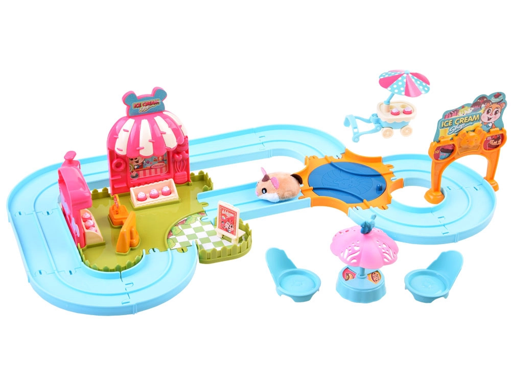 Ez a játékszett vidám fagyizó-világot hoz el egy aranyos hörcsöggel, amelynek puha bundája van, és már a kicsomagolás után azonnal akcióra kész – tápellátás: AG13 elem (a csomag tartalma). Bekapcsolás után a hörcsög elindul, magától irányt vált, és vezethető a mellékelt könnyen összerakható, váltós pályán. A csatlakoztatott kiskocsival finomságokat szállít a vendégeknek.
