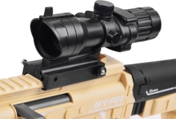 Ergonomikus markolat és homokszínű kivitel olyan kiegészítőkkel, mint az irányzék a valósághű, mégis biztonságos játékélményért.