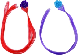 A szett része két szintetikus tincs virágos csatokkal - az egyik vörös lila rózsával, a másik lila kék rózsával.