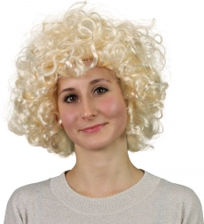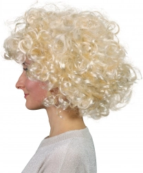Szintetikus paróka, amely hűen utánozza a természetes emberi hajat dús, gondosan formázott göndörséggel.
