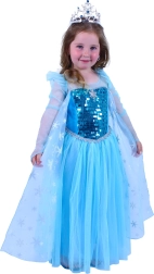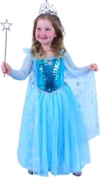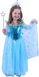 A hókirálynő gyermek jelmez minden kislányt a téli birodalom királynőjévé varázsol. A flitterekkel díszített csillogó felsőrész, a finom áttetsző ujjak és a csillogó pelyhekkel díszített könnyű köpeny mesés megjelenést hoz létre, amely első pillantásra magával ragad.