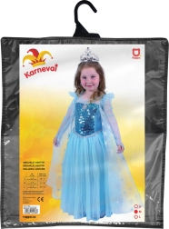 Bűvöld el a kis parádés kislányt egy varázslatos jelmezzel a mesebeli kalandokhoz. Ez az M méretű jelmez 117–128 cm magassághoz készült, és türkizkék ruha ragyogó flitterekkel, ezüst szegéllyel és könnyű, hópelyhekkel díszített köpenlyel – ideális jelmezbálra, karneválra és otthoni hercegnős játékhoz.