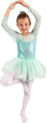 Elegáns balettruha hosszú, hálós ujjakkal és lebegő tüllszoknyával, amely kiemeli minden kis táncosnő lépését. A fényes, flitteres díszítés látványos hatást ad, míg a finom anyagok kényelmet és szabad mozgást biztosítanak.