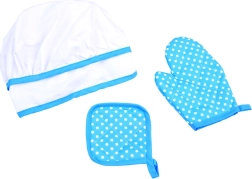 Gumis szakácssapka, zsebes kötény és hőálló kesztyű alátéttel – védi a ruhát és a kezeket, a gyerekek pedig igazi szakácsnak érezhetik magukat.