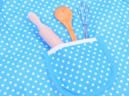 Aranyos szakácskészlet kis konyhai segítőknek: védi a ruhát, és motiválja a gyerekeket a főzésre és sütésre. Tartalmaz egy kötényt, szakácssapkát, kesztyűt, alátétet és praktikus eszközöket – nyújtófát, fa kanalat, habverőt és fém kiszúrókat. Szuper közös főzéshez, a képzelet fejlesztéséhez és szerepjátékhoz.