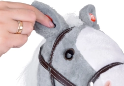 A füleken elhelyezett gombok nyerítés és vágtázás hangját indítják, miközben a ló kinyitja és becsukja a száját, ami még élethűbbé teszi a játékot.