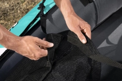 Praktikus részletek, mint a körbefutó biztonsági kötél, a tárolóhely és a kivehető táska megkönnyítik a felszerelés rendszerezését. A mellékelt kézi pumpa gyors vízreszállást biztosít, a végén pedig a kajak könnyen leereszthető és kompakt módon elpakolható.