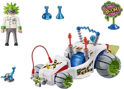 Rajtoljatok el az őrült professzorral és tudományos gokartjával! A felhúzható (pull-back) hajtásnak köszönhetően a jármű előrelő, miközben a kémcsövek, a „sugárhajtás” és az elektromos felszerelés minden versenyhez jókora adag fantáziát ad. A futurisztikus karosszériát különféle kiegészítőkkel díszíthetitek, így egyedi versenygépet hozhattok létre.