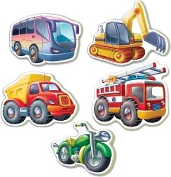 A készlet öt, fokozatos nehézségű kirakót tartalmaz kedvelt járműtémákkal – az autóbusztól a tűzoltóautóig. A fokozatosan növekvő nehézségnek (3, 4 és 5 darab) köszönhetően a gyerekek természetes módon gyakorolják a logikus gondolkodást és a türelmet. A vidám színek és barátságos illusztrációk fenntartják a figyelmet és növelik az örömteli felfedezést.