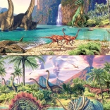 Ez a szett dupla élményt nyújt: két különálló puzzle azonos darabszámmal és megegyező mérettel. Mindkét motívum összeállítása után csak egymás mellé kell illeszteni őket, és máris egy látványos panorámaképet kap, tele dinoszauruszokkal, amely feldob bármely gyerekszobát.