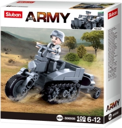 A Sluban háborús motorkerékpár lánctalppal ideális a második világháború rajongói számára. Jellemzői az innovatív design és a kiváló minőségű kivitelezés, ellenálló ABS műanyagból készült, ami magas kompatibilitást biztosít más építőkészletekkel.