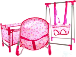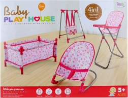 A 4 az 1-ben babaszett tartalmaz egy pihenőszéket, hintát, etetőszéket és kiságyat. A csomag mérete kb. 37 × 47,5 × 10 cm. 3 éves kortól.