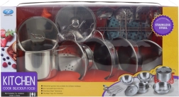 A rozsdamentes edénykészlet tartalmaz egy lábast, szűrőt, serpenyőt, tálat, alacsony lábast, 2 fedőt, merőkanalat leveshez, lapátot, kézi kis szűrőt és tésztamerőkanalat. Dobozban csomagolva. A csomagolás méretei kb. 38×20×10 cm. 3 éves kortól
