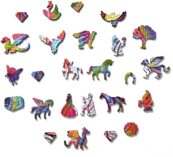 Fa Puzzle Szivárvány Unikornis kiváló választás a puzzle rajongók számára, akik szórakoztató és kihívást jelentő élményt keresnek. Ez az összetett kirakó színes és egyedi darabokat kínál, amelyek együtt egy varázslatos unikornis képét alkotják.
