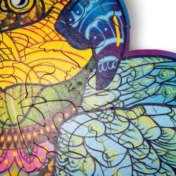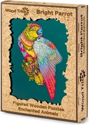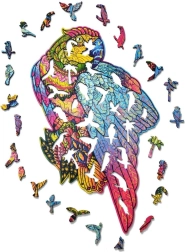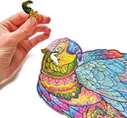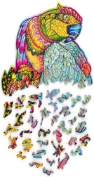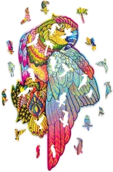 Ez a papagáj alakú fa puzzle örömet és kihívást nyújt minden puzzle-rajongónak. 14 éven felüli gyermekek számára is alkalmas, és nem csak játék, hanem dekoratív tárgyként is szolgál. Minden darab egyedi, és életet visz a térbe a színeivel.