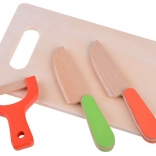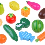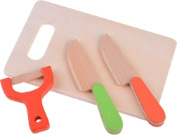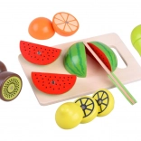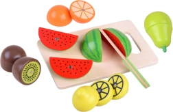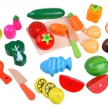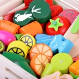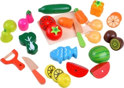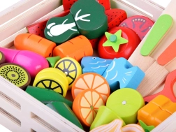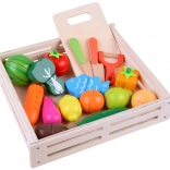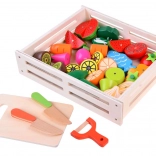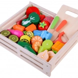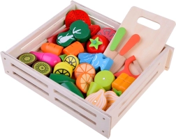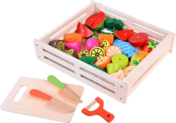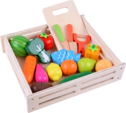 A csomag tartalma: Fa láda, vágódeszka, kétoldalas kés, hámozó, különféle gyümölcsök és zöldségek, mint paradicsom, répa, uborka, paprika, eper, kivi és még sok más.