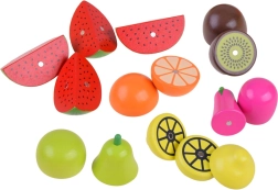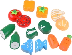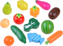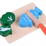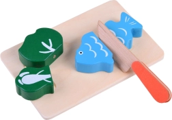 Ez a fa készlet sokféle gyümölcsöt, zöldséget és halat tartalmaz, mindegyik mágnesekkel ellátva a könnyű szeletelés érdekében. Minden darabot minőségi fából formáztak, nem mérgező festékekkel festve, melyek biztosítják a kicsik biztonságát.