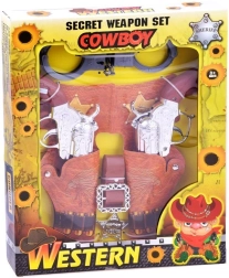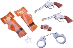 A készlet mindent tartalmaz, ami a valósághű cowboy játékhoz szükséges: 2 revolvert, bilincset, övet és seriff csillagot.