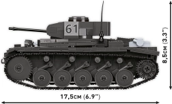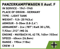 A Panzerkampfwagen II tank a második világháború korai szakaszának egyik kulcsfontosságú német tankja volt. Ez az építőkészlet 813 darabot tartalmaz, és 1:28 méretarányban készült. A darabok magas minőségű nyomatokkal rendelkeznek, amelyek nem kopnak le játék közben. A modellhez nyitható kupola tartozik, amelybe egy tankos figura helyezhető. A torony 360 fokban forgatható, míg az ágyú és a géppuska lefelé és felfelé mozgatható. A kupola alatt található egy építőkész motor, amely szintén kiállítható a modell mellett. A készlet tartalmaz egy tankos figurát barettel és P08 Parabellum pisztollyal.