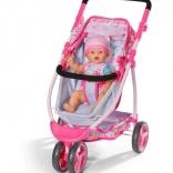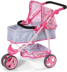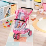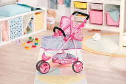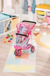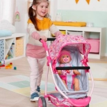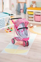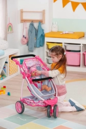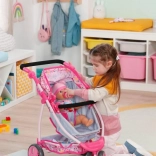 A babakocsi három kerékkel rendelkezik, amelyek könnyű kezelhetőséget biztosítanak, és állítható magasságú fogantyúi lehetővé teszik a használatot különböző korú gyerekek számára. A játék végeztével a babakocsi könnyen összecsukható, ami praktikus a kis helyen való tároláshoz.