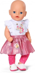 Varázslatos, kényelmet és stílust ötvöző öltözéket adhat BABY born Little (36 cm) babájára. A fehér, fodros ujjú és vidám mintás top viselhető önmagában kis ruhácskaként, vagy párosítható a csillagmintás rózsaszín leggingssel és a csillogó szoknyával. A szettet fehér, részletgazdag csillagokkal díszített cipőcskék egészítik ki a tökéletes összhatáshoz.