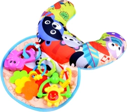 A baba előtt vidám játékok vannak, amelyek motiválják a fejecske emelésére és a hátizmok erősítésére.