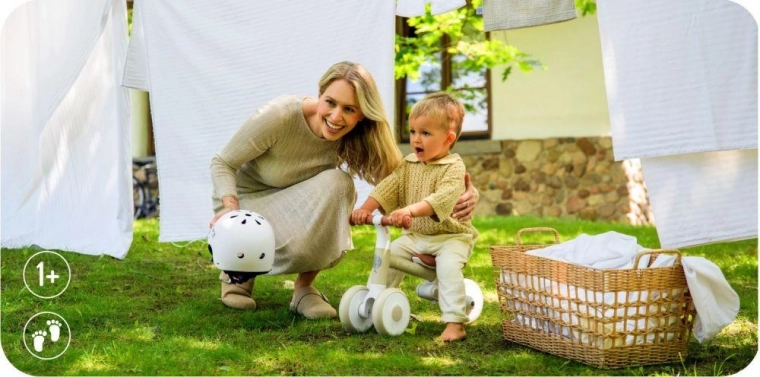A MoMi DEX futóbicikli 1 éves kortól használható. Stabil kialakításának köszönhetően azoknak is megfelelő, akik még csak most tanulnak járni. Valójában a MoMi DEX ideális a járni tanuló gyermekek támogatására és egyensúlyérzékük fejlesztésére. Stabil és biztonságos.