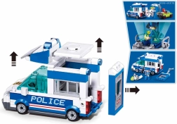 Ez a rendőrautó összekapcsolható műanyag kockákból készült, rendelkezik műholdas antennával és mozgatható ajtókkal.