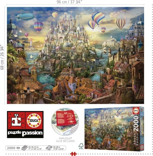 Élvezze a hosszú órákon át tartó szórakozást az EDUCA Álommezőváros kirakóval. A minőségi nyomatnak és a pontos illesztéseknek köszönhetően a darabok tökéletesen passzolnak, így látványos, lakásdekorációnak is alkalmas kép születik. A csomagban megtalálja a FIX PUZZLE ragasztót is, így a kész művet azonnal rögzítheti és kiállíthatja.