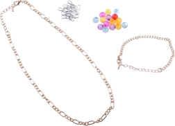 Tartozik hozzá jegyzetfüzet, matricák, ceruza és hegyező, valamint gyöngyök, láncok és medálok saját karkötők készítéséhez.