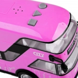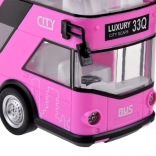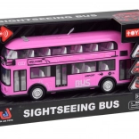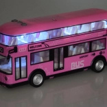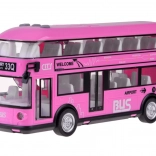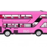 Vidám rózsaszín kétszintes busz, amely biztosan felkelti sok kis sofőr és a buszok rajongóinak figyelmét. Ez a valósághű, kétszintes busz nagy precizitással készült, kellemes rózsaszín színben, teljes egészében műanyagból. A busz szórakozást garantál hang- és fényhatásoknak köszönhetően. A busz ajtói nyithatók, az üvegablakok mögött ülések és kormány található, így a játék még élethűbb. A busz egyik előnye a felhúzós mozgás funkció. Elég a játékot hátrahúzni a talajon hátulról vagy elölről, és a busz elindul.