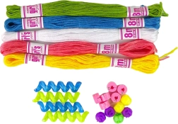 Színes gyöngyök és öt, egyenként nyolc méteres cérna (zöld, kék, fehér, rózsaszín, sárga) a végtelen kombinációkért és az egyedi stílusért.