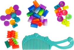 A dobozban bőséges válogatású gyöngyöket találsz rózsaszín, sárga, lila, zöld, kék és narancssárga árnyalatokban, valamint öt pamut cérnát (zöld, kék, fehér, rózsaszín, sárga), mindegyik 8 m hosszú. A csomagban praktikus kék fésű és részletes, lépésről lépésre styling útmutató is található.