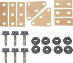 - Szerelő kocsi–műhely; lapos csavarhúzó; kalapács; villás/gyűrűs kulcs; satu; perforált lamellák × 8; csavar × 8; anya × 8; nagy szeg × 2; formák a berakóhoz (négyzet, háromszög, kör); szerelőkészlet; barna szállítódoboz
