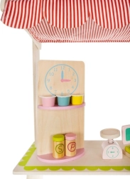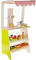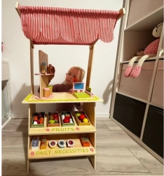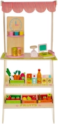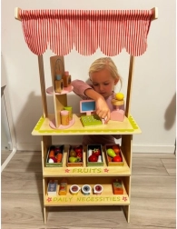 Adj a gyerekeknek saját piaci standot! A csíkos tetővel, polcokkal és kijelölt gyümölcs és napi szükségletek szekciókkal ellátott, stílusos fa stand fejleszti a képzelőerőt, a kommunikációt és a finommotorikát. A valósághű tartozékok – pénztárgép szkennerrel, bankkártya, mérleg és forgatható tábla/„óra” – minden vásárlást izgalmas kalanddá varázsolnak.